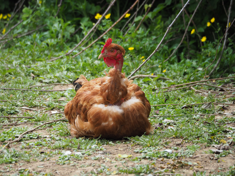 Poulets de race Cou Nu roux à croissance lente sont achetés à 1 jour, élevés en poussinière chauffée quelques semaines selon la saison puis en plein air, nourris aux grains 100% bio et soja toasté local.